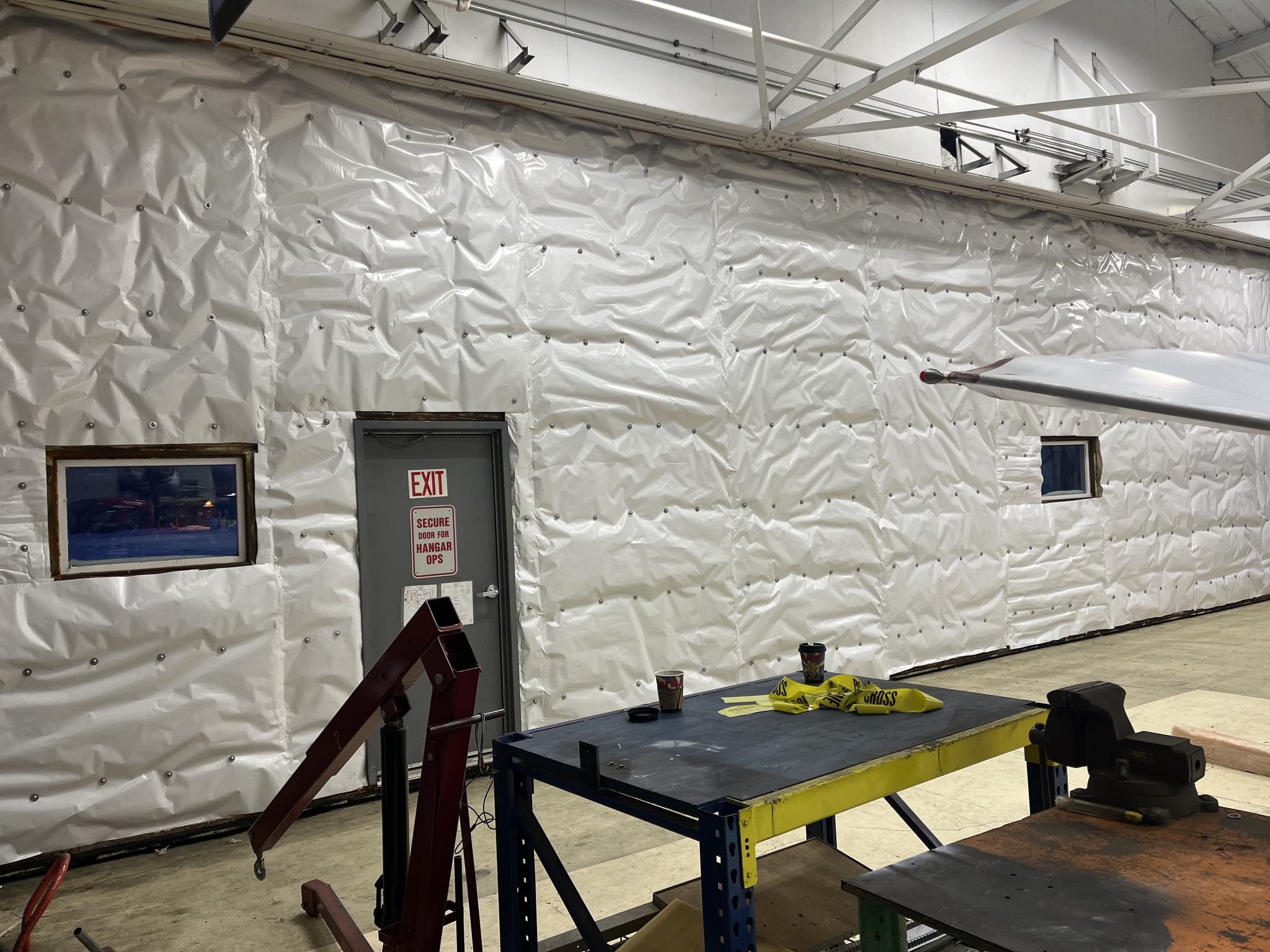 This project involved the installation of MBI (Metal Building Insulation) in an aircraft hangar to improve thermal performance and interior conditions. The insulation system was installed across the wall and door assemblies to create continuous coverage, reduce heat loss, and limit air infiltration. The finished system provides a cleaner interior appearance while supporting long-term efficiency and durability in a demanding environment.